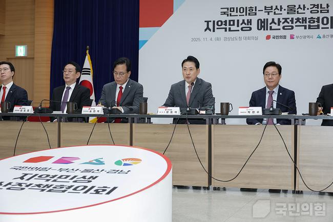 4일 경남 창원시 경남도청에서 열린 국민의힘-부산 · 울산 · 경남 지역민생 예산정책협의회에서 국민의힘 장동혁 대표(오른쪽에서 두번째)가 발언하고