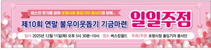 포항 시청 출입기자 봉사단이 연말을 맞아 지역 내 어려운 이웃을 돕기 위한 나눔 행사를 마련했다. ‘제10회 연말 불우이웃돕기 기금 마련 일일주점’이 오는 2025년 12월 11일(목) 오후 5시 30분부터 10시까지 포항시 북구 서동로 62-1(신흥동) 야마하피아노 2층 버스킹월드에서 열린다.