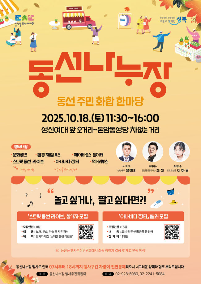 행사 추진위원회는 오는 9월 30일까지 아나바다 장터 판매자와 장기자랑 무대 참가자를 모집 중이다. 주민 누구나 신청 가능하며, 동선나누장 행사추진위원회(☎02-928-5080) 또는 동선동 주민센터 누리집을 통해 신청할 수 있다. 주최 측은 “많은 주민의 자발적 참여가 행사의 의미를 더욱 풍성하게 만들 것”이라며 적극적인 관심과 참여를 당부했다.
