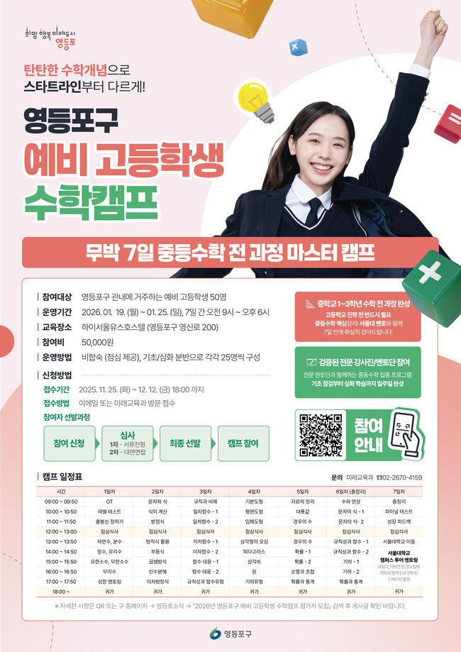 영등포구 `예비 고등학생 수학캠프` 홍보 포스터.서울 영등포구(구청장 최호권)는 고등학교 진학을 앞둔 관내 중학생을 대상으로 ‘예비 고등학생 수학캠프’를 운영하며 12월 12일까지 참가자 50명을 모집한다고 밝혔다.
