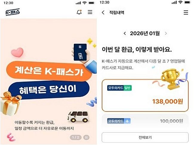 이용 방식도 간소화됐다. 별도의 신규 카드 발급 없이 기존 K-패스 카드를 그대로 사용하면 되고, 이용자가 사전에 환급 방식을 선택할 필요도 없다. 매월 대중교통 이용 금액을 합산해 기본형 환급 방식과 ‘모두의 카드’ 방식 중 환급액이 가장 큰 제도가 자동 적용된다. K-패스 앱과 누리집에서는 예상 환급액을 포함한 환급 내역을 한눈에 확인할 수 있도록 화면도 개선된다.