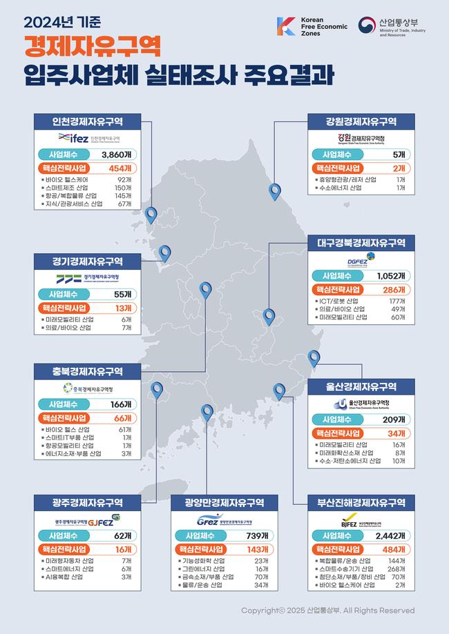 산업통상자원부와 9개 경제자유구역청이 실시한 ‘2024년 기준 경제자유구역 입주사업체 실태조사’ 결과, 외국인투자기업 수와 고용·투자가 큰 폭으로 늘며 경제자유구역이 지역경제의 핵심 성장거점으로 자리매김한 것으로 나타났다.