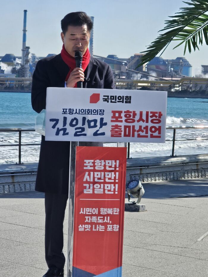 포항 송도 여신상 앞에 선 김일만 포항 시의장김일만 경북 포항시의회 의장이 포항시장 출마를 공식 선언했다.