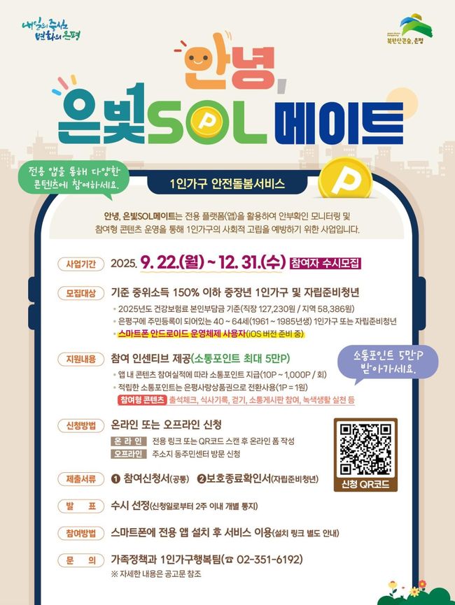 서울 은평구(구청장 김미경)는 지난 22일부터 1인 가구 안전돌봄서비스 ‘안녕, 은빛SOL메이트’ 참여자 모집을 시작했다고 밝혔다.