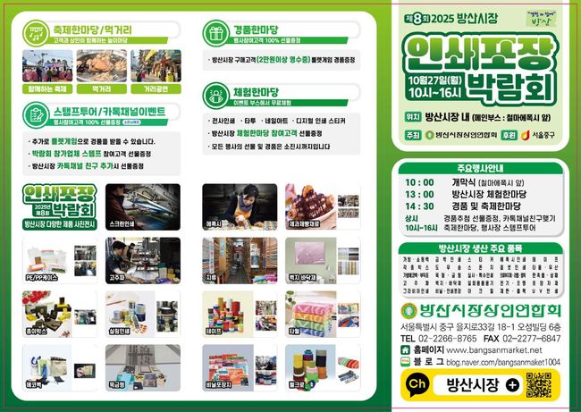 또한 타투 체험, 먹거리 부스, 룰렛 이벤트 등 가족 단위 방문객을 위한 즐길 거리도 마련됐다. 현장에서 방산시장 카카오톡 채널을 친구 추가하거나 2만 원 이상 구매하면 경품 이벤트에 참여할 수 있다.