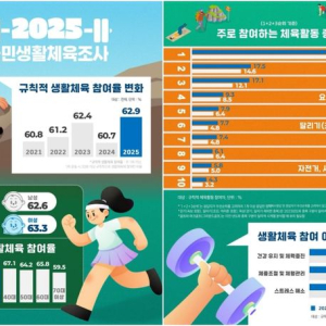 - 문화체육관광부는 만 10세 이상 국민 9천 명을 대상으로 한 ‘2025년 국민생활체육조사’ 결과, 생활체육 참여율이 62.9%로 전년 대비 2.2%포인트 상승하며 참여 빈도와 평균 운동 시간, 참여 기간이 모두 늘었다고 밝혔다.조사 결과 2025년 생활체육 참여율(주 1회, 30분 이상)은 62.9%로 집계됐다. 주 2회 이상 참여율도 52.2%로 전년보다 2.7%포..